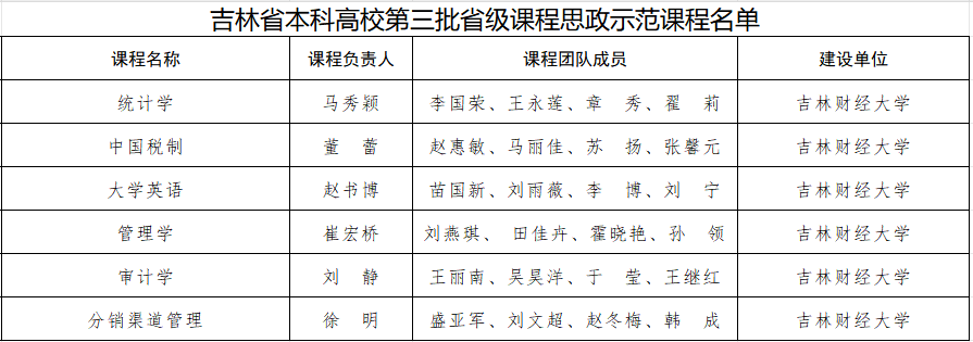 近日,吉林省教育厅公布了全省本科高校第三批省级课程思政示范课程名单,共遴选认定省级课程思政示范课程164门,其中我校的《统计学》《中国税制》《大学英语》《管理学》《审计学》《分销渠道管理》等6门课程成功入选,实现了学校在课程思政建设方面的又一新突破。一直以来,学校始终坚持立德树人根本任务,持续优化课程思政教育内容,积极探索创新课程思政建设方法路径,切实提升教师课程思政育人能力,着力强化课程思政建设...