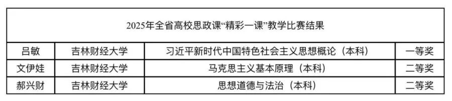 马克思主义学院教师在2025年全省高校思政课“精彩一课”教学成果展示中获得佳绩。近日,吉林省教育厅公布了2025年全省高校思政课“精彩一课”教学成果展示获奖名单,马克思主义学院教师吕敏荣获一等奖,文伊娃、郝兴财荣获二等奖。