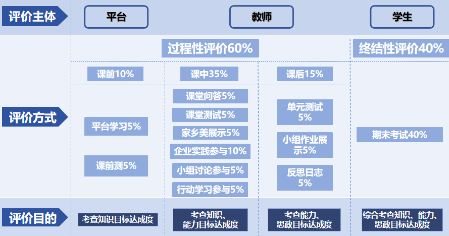 采用“60%过程性评价+40%终结性评价”模式,过程评价涵盖课前平台学习与测试(共10%),课中问答、测试、家乡美展示、企业实践参与、小组讨论、行动学习等环节(共35%),课后测试、小组作业、反思日志等(共15%),每个环节均嵌入思政目标;终结性评价侧重考察学生运用营销思维解决实际问题时的价值判断能力,实现知识考核与思政素养评价的有机统一(共40%)。见下图。