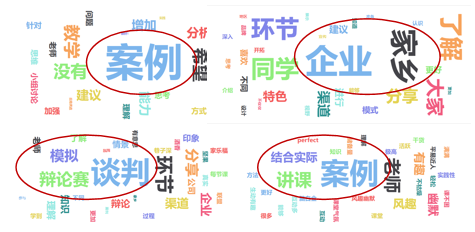 校内外同行评价一致认可,学生评教成绩连续三年为100分,获评“校级课程思政示范课程”。学生反馈高频词集中在课程思政教学创新的案例设计、家乡美、情景模拟等互动参与式教学,说明课程思政建设取得了较好的反馈效果。
