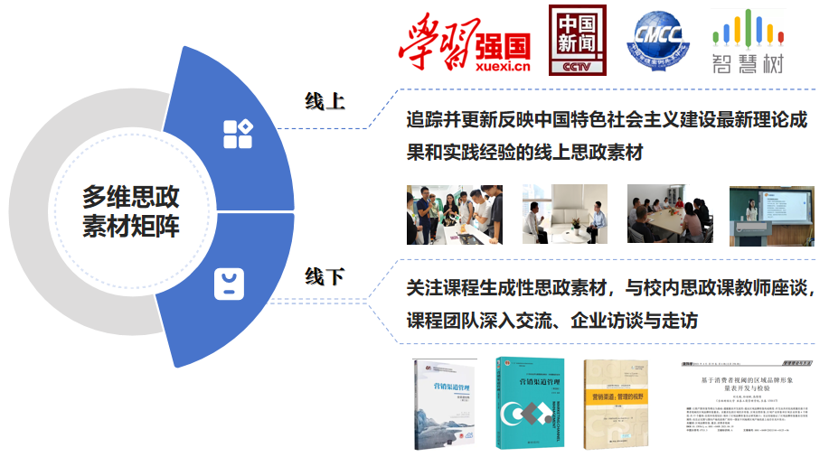 创新“多维思政素材矩阵+动态评审机制”。矩阵贯通线上线下渠道,建成“四库全书”资源库并标注思政标签,收录36个典型企业渠道管理案例、17家企业社会责任报告、10大行业发展报告、12个典型营销渠道负面行为清单;专家团队每学期评审素材,淘汰过时内容、补充新案例。讲授“渠道伦理”时,用某企业渠道下沉助力乡村振兴案例,对比负面清单案例,深化学生对社会责任的理解。
