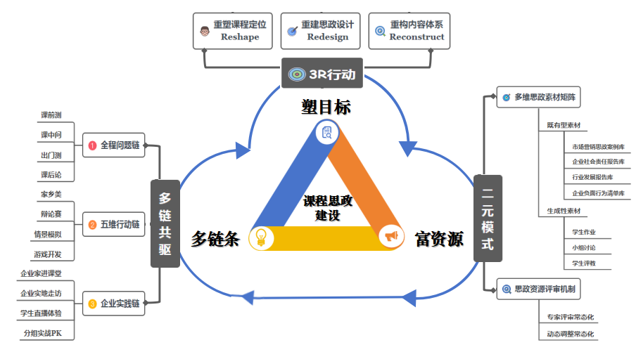 通过“重塑课程定位、重建思政设计、重构内容体系”,将社会主义核心价值观融入营销人才培养全流程,明确了课程思政定位、系统设计与内容体系,从知识传授、能力培养与价值塑造三个方面重新明确了课程思政目标体系。
