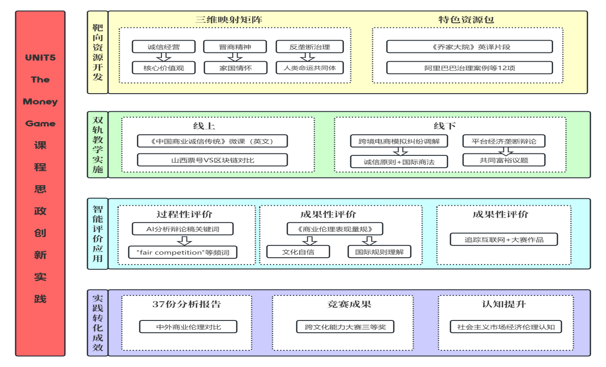 靶向资源开发:建立“单元主题—思政元素—育人目标”三维映射矩阵,构建财经特色思政资源库,实现教材解构与专业需求的精准对接。