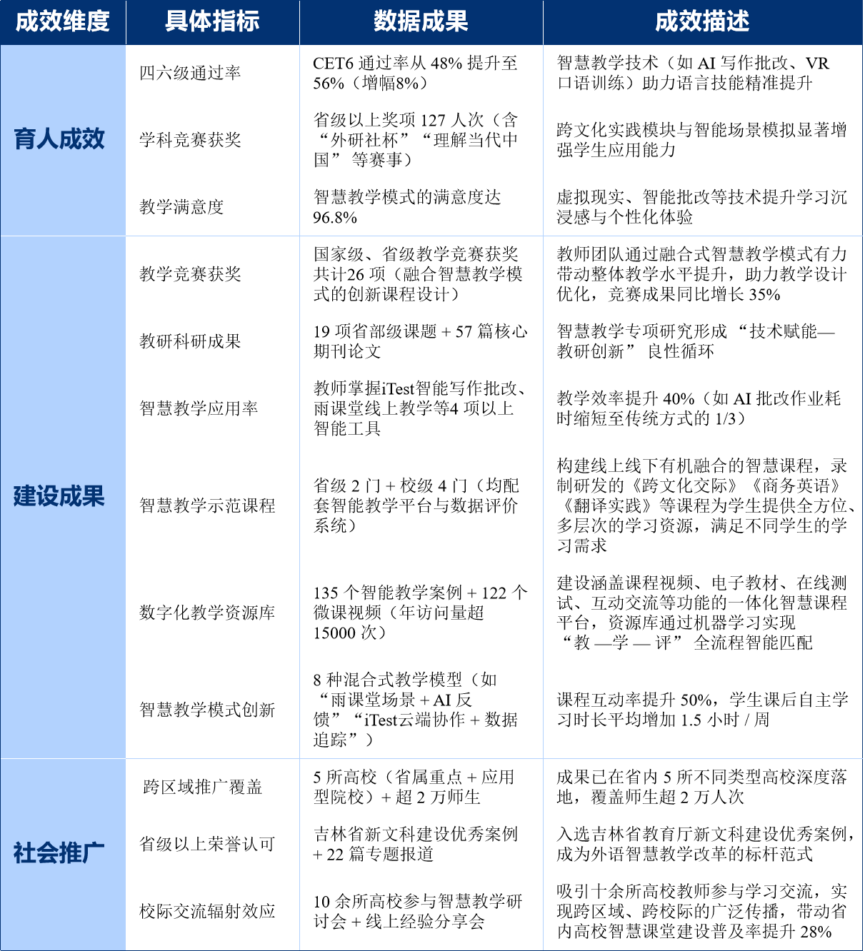 学生发展:经靶向挖掘奠定资源基础、多维融入强化能力培养、实践转化促进内化提升,学生英语四六级通过率提升24%(CET6 达 72%),127 人次获省级以上竞赛奖项,跨文化沟通等能力显著增强,教学满意度达 96.8%。