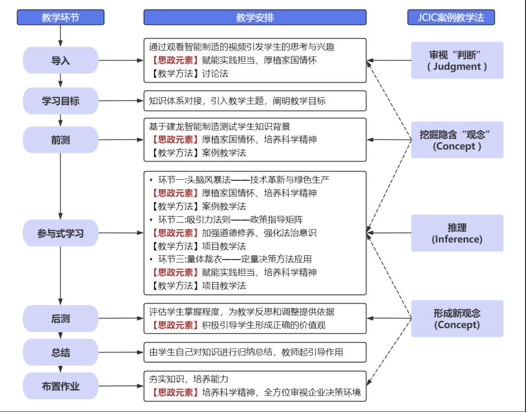 紧扣“管理中国化”实践主线,融合东方“以人为本、以德为先”的管理智慧与西方管理科学的理性体系,并整合习近平经济思想、国家战略、百年党史等,构建《管理学》教学体系。创新性采用JCIC(判断-观念-推理-认知)案例教学模式,强化价值引领的闭环升华。以吉林建龙集团“智能制造”转型为例:
