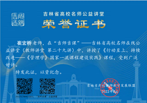 课程建设成果丰硕。《管理学》获评国家一流本科课程。相关教学改革成果获2023年吉林省教学成果二等奖。团队建成丰富思政资源库,包括课程思政案例30个、视频资源30个,吉商企业案例20个。(相关成果前面已展示)